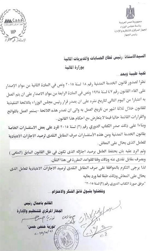 بالمستند| التنظيم والادارة: احتفاظ العامل برصيد إجازاته.. وصرف المقابل المادى لحين تطبيق قانون الخدمة المدنية