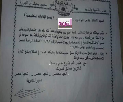 بالمستندات : تأجيل رحلة المعلمين إلى شرم الشيخ واسترداد المبالغ المدفوعة لسوء التنظيم