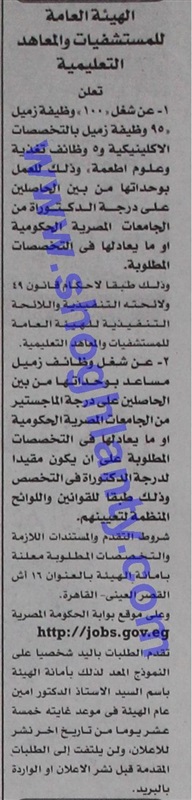 أعلنت وزارة الصحة والسكان عن وجود 200 وظيفة شاغرة بالهيئة العامة للمستشفيات والمعاهد التعليمية من بين الحاصلين على الدكتوراه من الجامعات المصرية الحكومية او ما يعادلها فى التخصصات المطلوبة الموضحة بالاعلان المرفق فى الخبر، وعلى الراغبين فى التقدم الذهاب الى الهيئة 16أش القصر العينى/ القاهرة، وعلى موقع البوابة الحكومية المصرية: http://jobs.gov.eg
