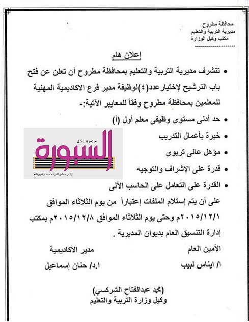اعلنت مديرية التربية والتعليم بمحافظة مطروح عن فتح باب الترشح لاختيار 4 لوظيفة مدير فرع الاكاديمية المهنية للمعلمين بمحافظة مطروح وفقا للمعايير الاتية :