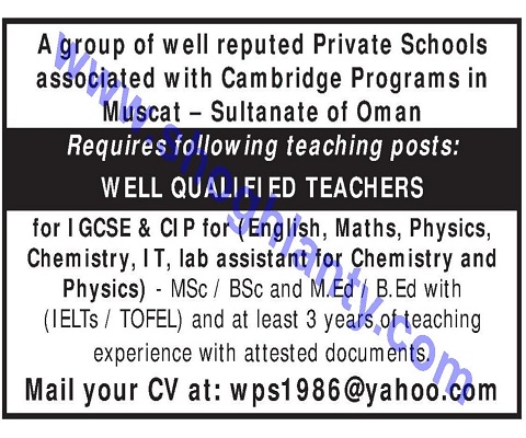 تعلن عدد من المدارس الخاصة في سلطنة عمان عن حاجتها للتعاقد مع معلين في المواد ووفقا للشروط التالية: