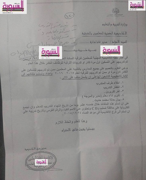 يرجي التكرم بالتعميم علي جميع المدارس بالتنبيه علي المعلمين ممكن تم تدريبهم للتسكين علي الكادر لاول مرة او ممن تم تدريبهم للترقية لعام 2015/2016 باعداد وتسليم ملفاتهم الي الادارة التعليمية التابعين لها علي ان يشمل ملف الاتي: