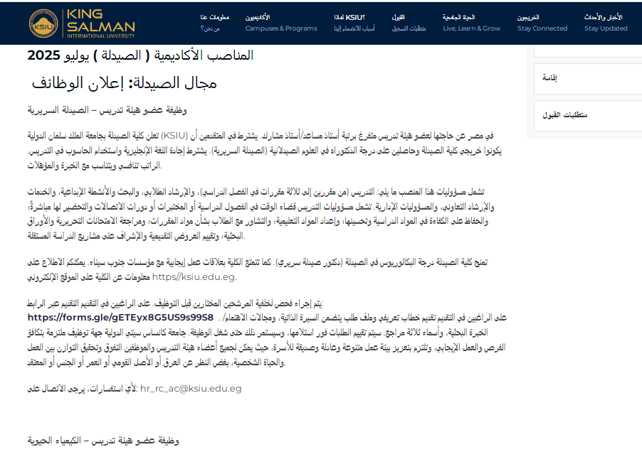 وظيفة جامعة .. في إطار خطتها التوسعية لتعزيز الكفاءات الأكاديمية والارتقاء بالعملية التعليمية، أعلنت كلية الصيدلة بجامعة الملك سلمان الدولية (KSIU) عن فتح باب التقديم لشغل عدد من الوظائف الأكاديمية لأعضاء هيئة التدريس ومساعدي التدريس، وذلك في 8 تخصصات مختلفة بمجال العلوم الصيدلانية، تشمل التعيين في درجات أستاذ مساعد، أستاذ مشارك، ومحاضر، بالإضافة إلى وظائف لمساعدي التدريس من خريجي السنوات الأخيرة.