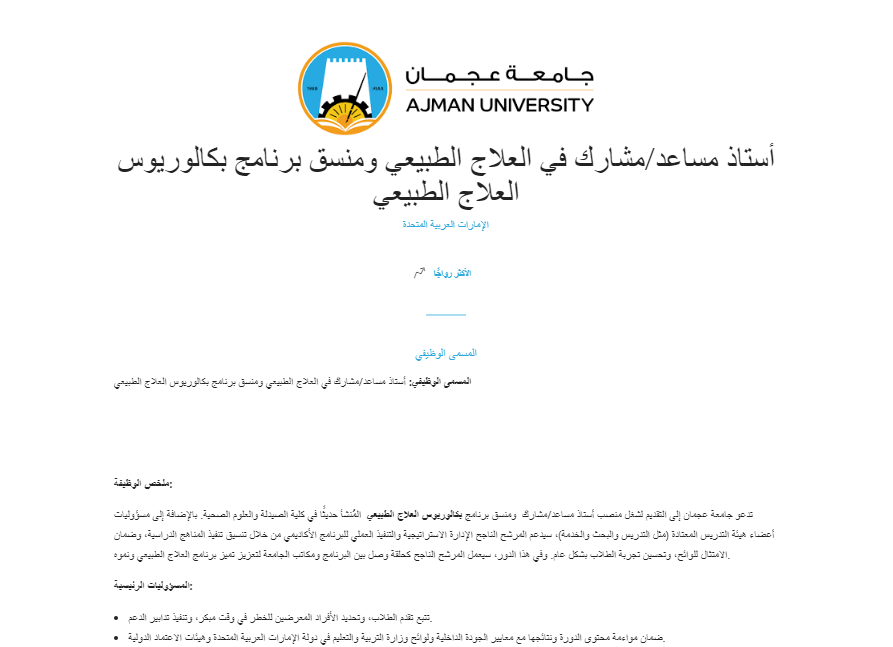 وظيفة جامعة .. أعلنت جامعة عجمان عن فتح باب التقديم لشغل وظيفة أستاذ مساعد أو أستاذ مشارك في العلاج الطبيعي، مع تولّي مهام منسق برنامج بكالوريوس العلاج الطبيعي، وهو البرنامج الذي أُطلق مؤخرًا ضمن كلية الصيدلة والعلوم الصحية بالجامعة.