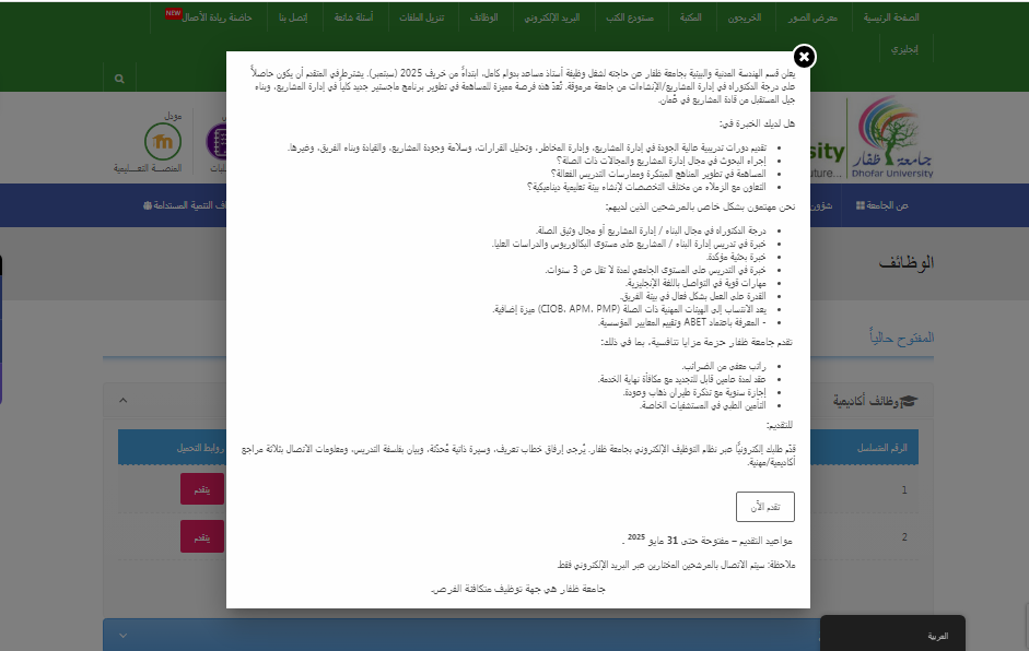 نص إعلان وظيفة جامعة ظفار 2025