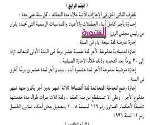 اضاف ، حماد ان نص في البند الرابع منه على الاجازات المخصصة للطرف الثاني طوال مدة العقد ومنها اجازة الوضع ونص على الأتى :-