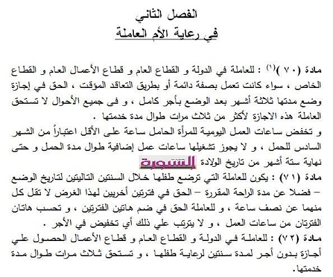 (( للعاملة في الدولة و القطاع العام و قطاع الأعمال العام و القطاع الخاص ، سواء كانت تعمل بصفة دائمة أو بطريق التعاقد المؤقت ، الحق في إجازة وضع مدتها ثلاثة أشهر بعد الوضع بأجر كامل ، و فى جميع الأحوال لا تستحق العاملة هذه الاجازة لأكثر من ثلاث مرات طوال مدة خدمتها .