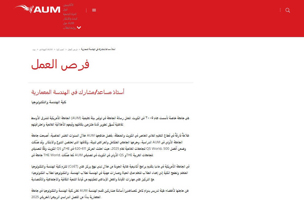 نص إعلان وظيفة الجامعة الأمريكية للشرق الأوسط بالكويت
