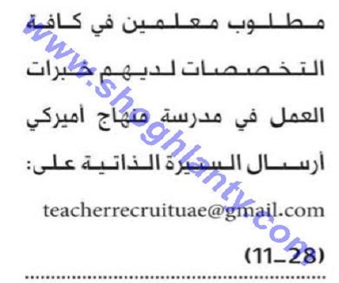 تعلن مدرسة في دولة الامارات عن حاجتها للتعاقد مع معلمين في جيمع التخصصات وذلك وفقا للشروط التالية:
