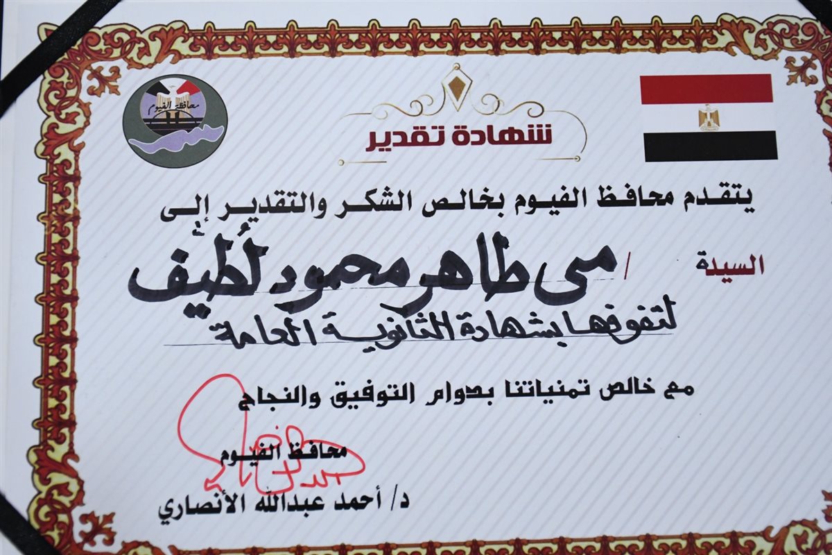 محافظ الفيوم يُكرِّم طالبة متفوقة بالثانوية العامة من ذوي الهمم