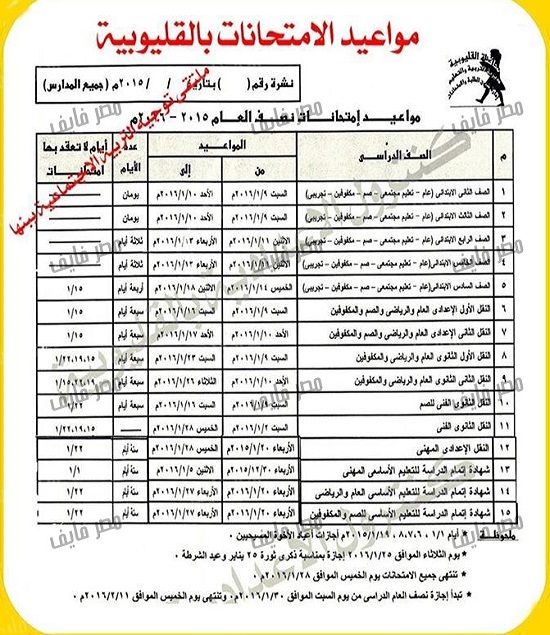 نقدم لكم جدول ومواعيد امتحانات نصف العام 2016 بمحافظة القليوبية للشهادة الإبتدائية والإعدادية على السواء والتى تبدأ من الفترة ما بين التاسع من يناير وحتي السابع والعشرين من الشهر ذاته، وكان وكيل مديرية التربية والتعليم بمحافظة القليوبية قد أعلن عن جدول إمتحانات المحافظة للترم الأول بعد أن قام محافظ القليوبية بإعتمادها رسميا من خلاله .