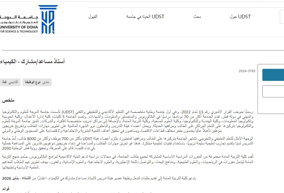 وظيفة جامعة.. تعلن كلية التربية العامة جامعة الدوحة للعلوم والتكنولوجيا عن وظائف أعضاء هيئة التدريس في وظيفة أستاذ مساعد/مشارك في الكيمياء علما بان بداية التعيين يناير 2026.