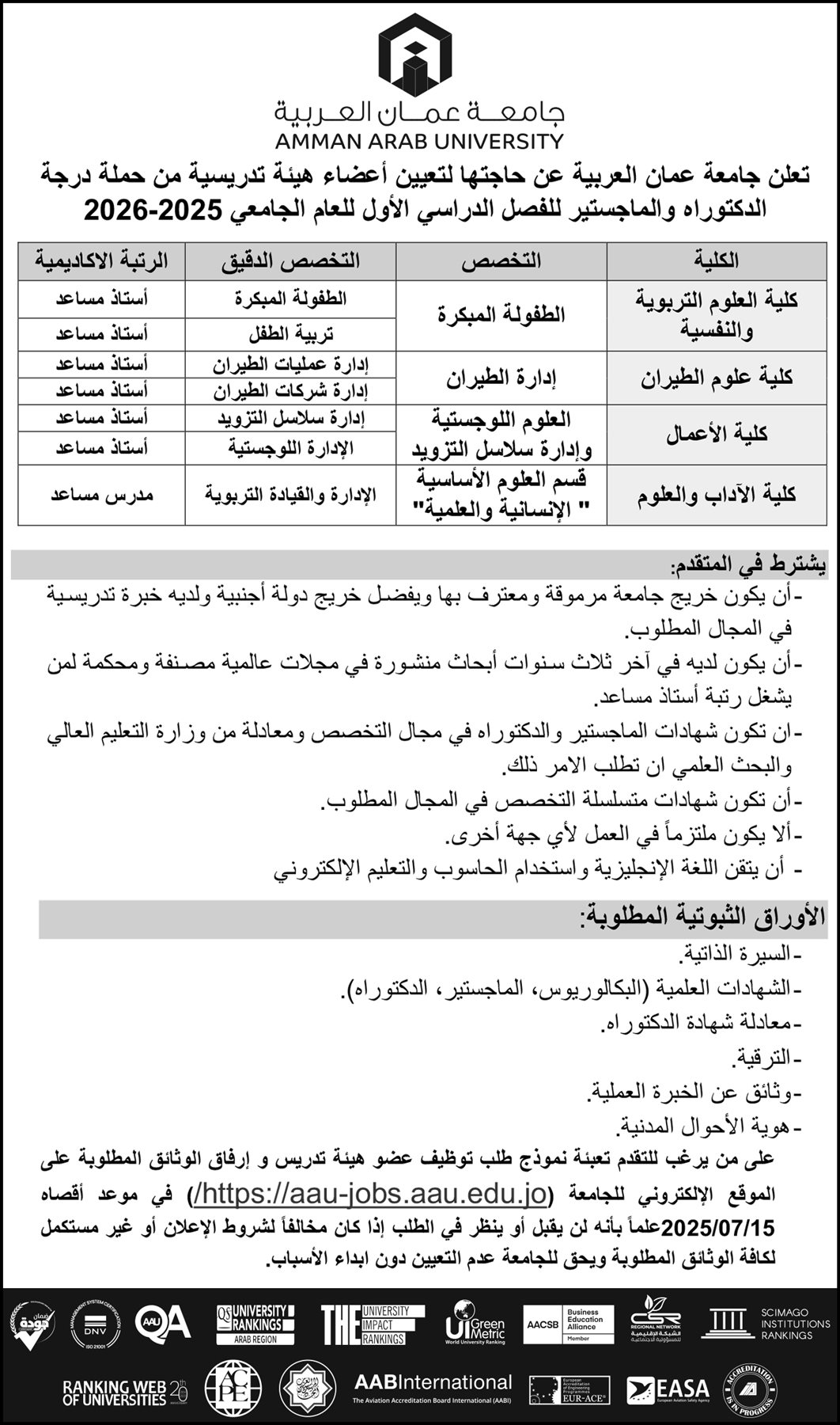 يُذكر أن جامعة عمان العربية تحظى بمكانة متميزة بين مؤسسات التعليم العالي في الأردن، وتتبنى نظامًا أكاديميًا مرنًا يواكب التغيرات العالمية في التعليم الجامعي، مما يجعلها بيئة جاذبة للكوادر الأكاديمية المؤهلة.