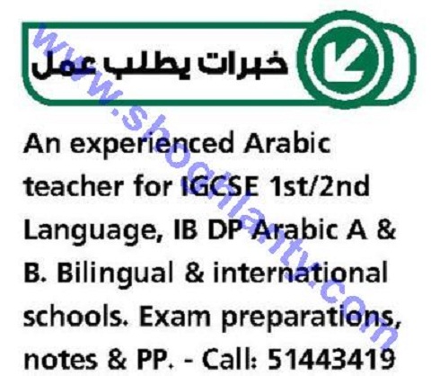 تعلن مدرسة خاصة في دولة الكويت عن حاجتها للتعاقد مع معلمين لغة عربية وذلك للعمل في مدارس انتر ناشونال وذلك وفقا للشروط التالية: