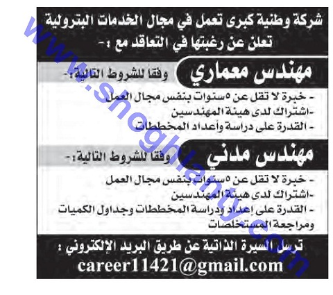 تعلن شركة سعودية كبري في مجال الخدمات البترولية عن رغبتها في التعاقد مع مهندسين وذلك في التخصصات التالية: