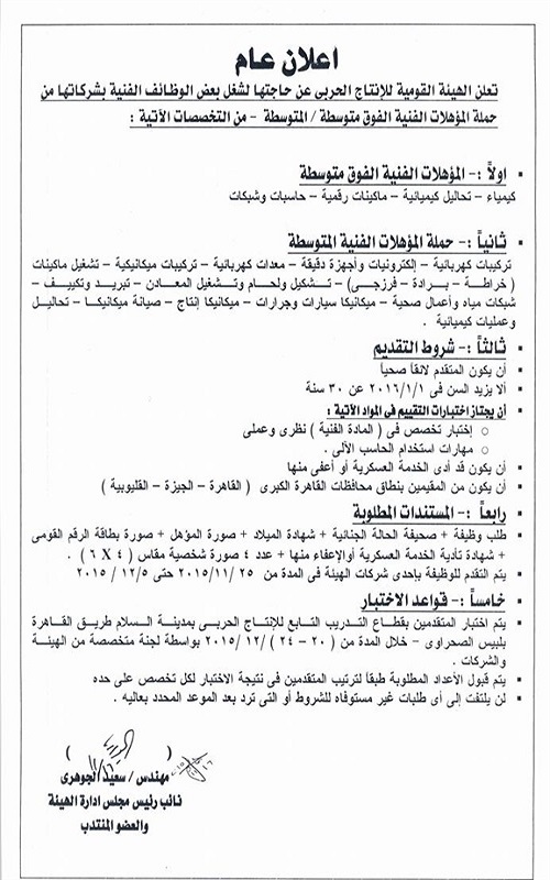الانتاج الحربى تعلن عن وظائف للمؤهلات المتوسطة وفوق المتوسطة.. ننشر الشروط والتفاصيل