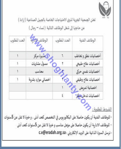 تعلن الجمعية الخيرية لذوى الاجتياحات الخاصة بالجبيل الصناعية بالمملكة العربية السعودية عن حاجتها لشغل عدد من الوظائف "نساء ورجال"، اخصائيين نفسيين، وعلاج طبيعى، ونطق وتخاطب، وعلاج وظيفى، ونفسى حركى، وعلى الراغبين فى التقدم ارسال السيرة الذاتية على البريد الالكترونى التالى: [email protected]