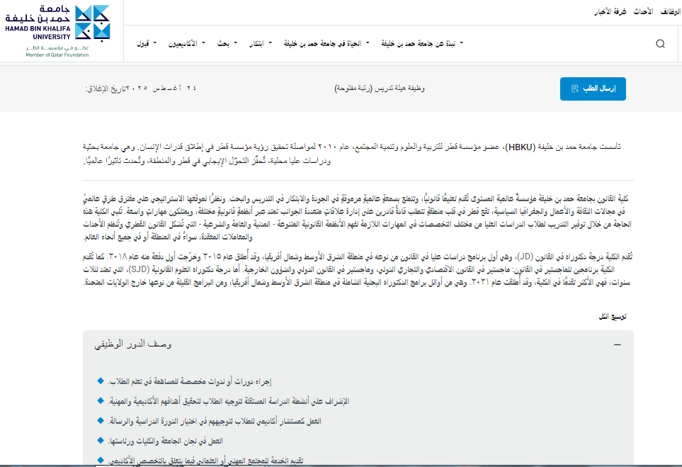 التقديم على وظائف كلية القانون بجامعة حمد بن خليفة