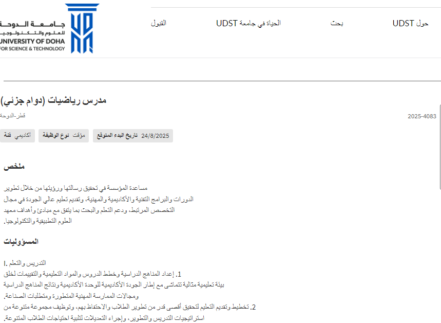 وظيفة جامعة .. أعلنت جامعة الدوحة في قطر عن فتح باب التقديم لشغل وظيفة مدرس رياضيات بنظام الدوام الجزئي، على أن يبدأ العمل اعتبارًا من الرابع والعشرين من أغسطس 2025.