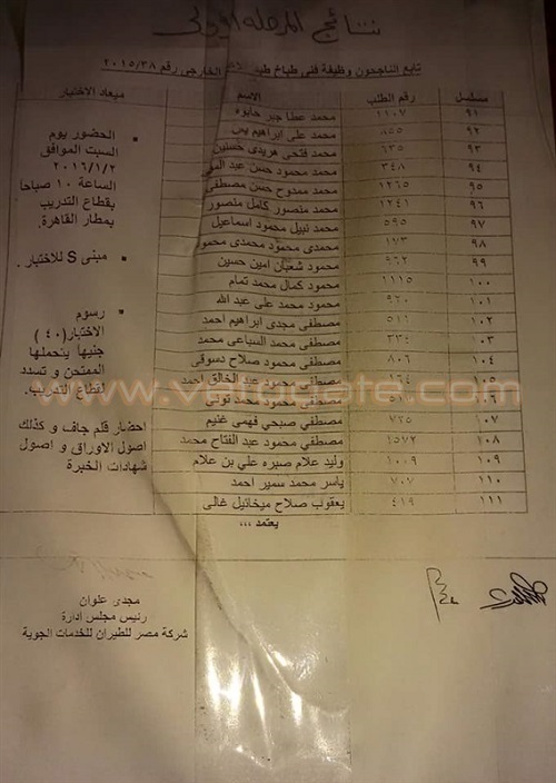وطالبت الشركة الناجحين بالتوجه في الثاني من يناير المقبل إلى مركز التدريب بالمطار، وسداد 40 جنيها لقطاع التدريب، وإحضار أصول الأوراق الخاصة وشهادات الخبرة.