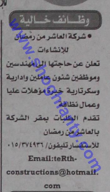 تعلن شركة العاشر من رمضان للانشاءات عن حاجتها الى مهندسين وموظفين شئون عاملين، وادارية، وسكرتارية، مؤهلات عليا، وعلى الراغبين فى الحصول على وظيفة تقديم الطلبات بمقر الشركة بالعاشر من رمضان، وللاستفسار يرجى الاتصال على التليفون التالى: 015374936، أو على الايميل التالى [email protected]
