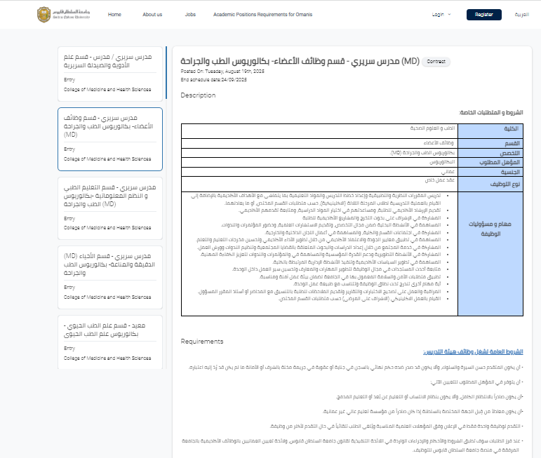 وظيفة جامعة.. أعلنت جامعة السلطان قابوس عن توافر وظيفة شاغرة في كلية الطب والعلوم الصحية، حيث فتحت باب التقديم لشغل وظيفة مدرس سريري بقسم وظائف الأعضاء، وذلك في إطار حرصها على استقطاب الكفاءات العمانية الشابة المؤهلة أكاديميًا ومهنيًا للمشاركة في مسيرة تطوير التعليم الطبي والبحث العلمي داخل السلطنة.