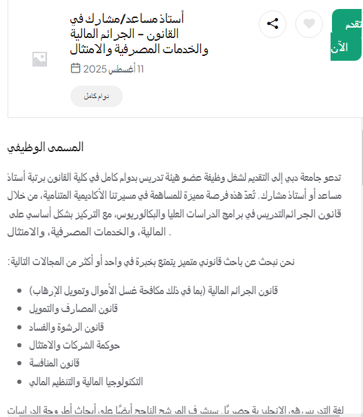 تمثل هذه الفرصة خيارًا مميزًا للباحثين الطامحين إلى الانضمام لبيئة تعليمية رائدة تسعى للتميز في التدريس والبحث العلمي، خاصة في مجالات قانون الجرائم المالية والخدمات المصرفية والامتثال.
