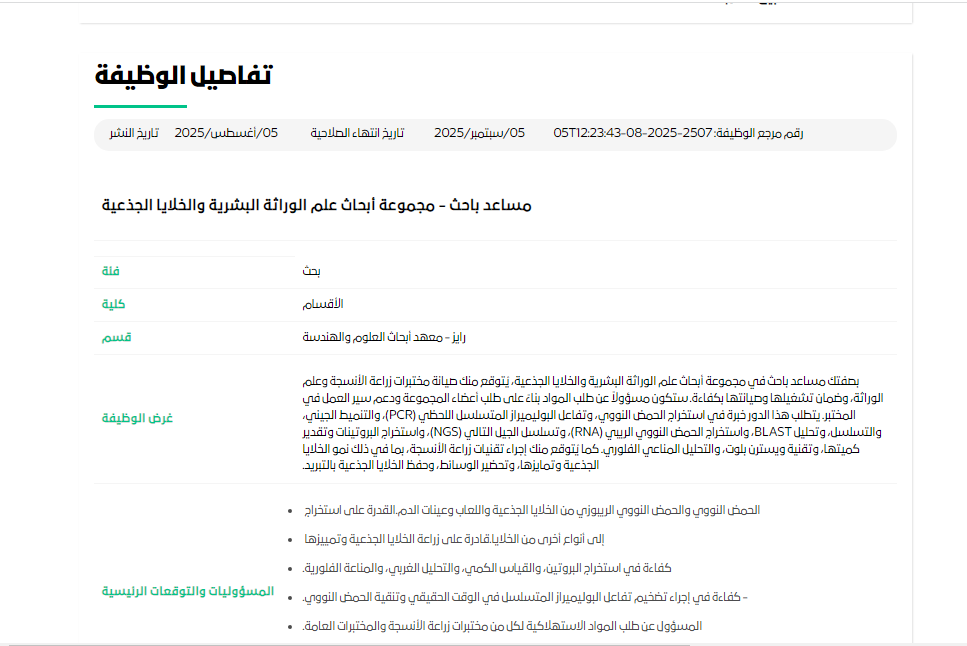 وتعتبر هذه الوظيفة فرصة ثمينة للباحثين الشباب الذين يتطلعون إلى تعزيز خبراتهم العملية والانخراط في أبحاث متقدمة بمجال علم الوراثة البشرية والخلايا الجذعية، إذ توفر جامعة الشارقة بيئة علمية داعمة تساعد على تطوير القدرات البحثية وتحقيق إنجازات تسهم في خدمة المجتمع العلمي والطبي.