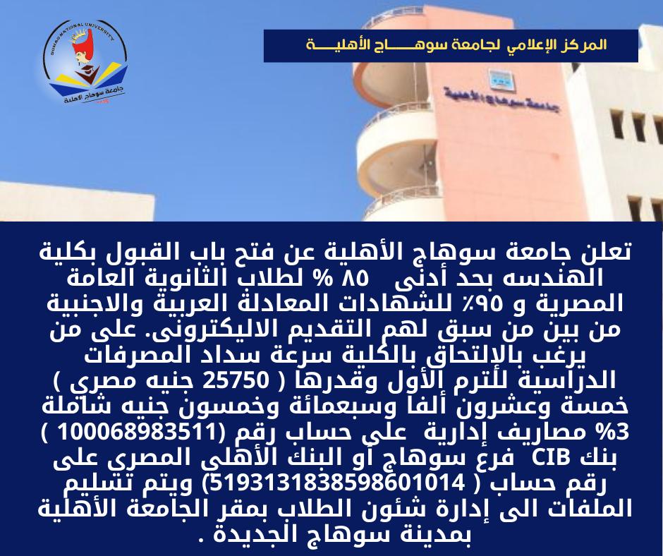 أعلنت جامعة سوهاج الأهلية عن فتح باب القبول بكلية الهندسة للعام الجامعي الجديد، حيث حددت الجامعة الحد الأدنى للقبول بنسبة 85% لطلاب الثانوية العامة المصرية و95% للشهادات المعادلة العربية والأجنبية من بين الطلاب الذين سبق لهم التقديم الإلكتروني عبر بوابة القبول الخاصة بـ جامعة سوهاج الأهلية.
