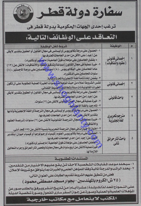تعلن سفارة دولة قطر في مصر عن حاجتها للتعاقد مع عدد من للحاصلين علي الماجستير والدكتوراه وذلك في التخصصات التالية: