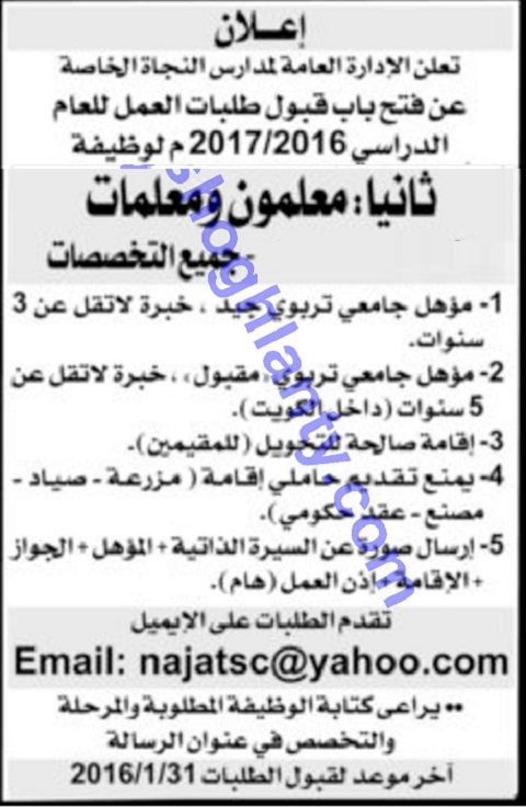 تعلن مدرسة خاصة في دولة الكويت عن حاجتها للتعاقد مع معلمين وذلك في التخصصات التالية: