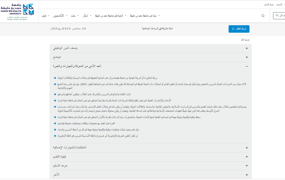 وظيفة جامعة.. في إطار سعيها المستمر لترسيخ مكانتها كجامعة بحثية عالمية المستوى، أعلنت جامعة حمد بن خليفة في قطر عن فتح باب التقديم لشغل وظيفة أستاذ مشارك في الدراسات الإسلامية بكلية الدراسات الإسلامية.