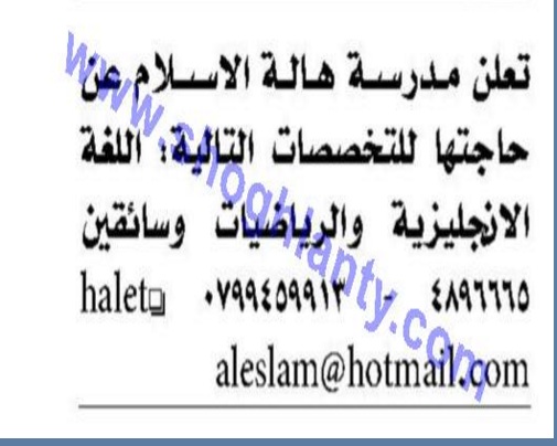 تعلن مدرسة هالة الاسلام بالمملكة الاردنية الهاشمية عن حاجتها الى معلمين فى الرياضيات واللغة الانجليزية، وكذلك سائقين، وعلى الراغبين فى الحصول على الوظائف الاتصال بالارقام التالية: 4896665/ 0799459913 أو على الايميل التالى halet [email protected]