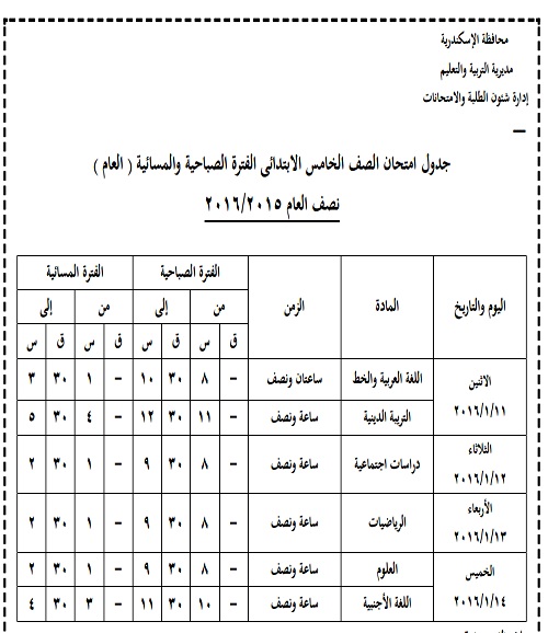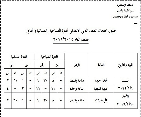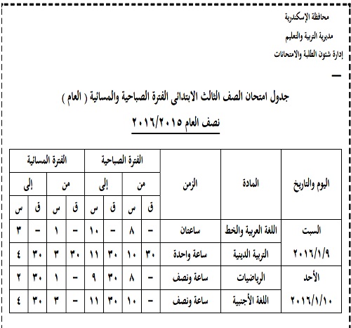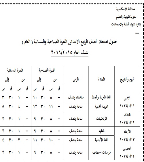 اعتمدت مديرية التربية والتعليم بمحافظة الإسكندرية جداول مواعيد امتحانات الفصل الدراسى الأول 2016 لمرحلة التعليم الابتدائى، حيث تبدأ امتحانات الصف الثانى والثالث الابتدائى اعتبارا من يوم 9 يناير وينتهى فى اليوم التالى 10 يناير، بينما تبدأ امتحانات الصف الرابع والخامس يوم الاثنين الموافق 11 يناير وتنتهى يوم الخميس 14 يناير.