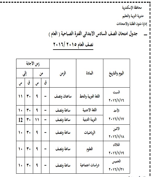 بالصو| جدول امتحانات المرحلة الابتدائية بالاسكندرية