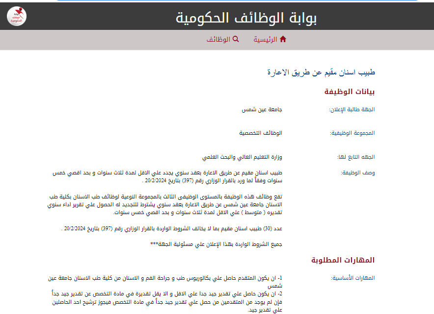 وتقع هذه الوظائف في المستوى الثالث من المجموعة النوعية لوظائف أطباء الأسنان، وتشمل مهامها العمل داخل كلية طب الأسنان بجامعة عين شمس، حيث سيتم اختيار المقبولين وفقًا لمجموعة من المعايير والشروط الدقيقة لضمان اختيار الكفاءات القادرة على خدمة العملية التعليمية والبحثية والطبية بالجامعة. وأكدت الكلية أن جميع الشروط الواردة في الإعلان تقع على مسئولية الجهة الطالبة للإعلان.