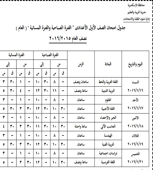 اعتمدت مديرية التربية والتعليم بمحافظة الإسكندرية جداول مواعيد امتحانات الفصل الدراسى الأول 2016 لمرحلة التعليم الاعدادى، حيث تبدأ امتحانات الصف الأول والثانى اعتبارا من يوم 16 يناير وتتتهى فى يوم 21 يناير، بينما تبدأ امتحانات الصف الثالث السبت الموافق 23 يتاير وتنتهى يوم الخميس الموافق 28 يناير.