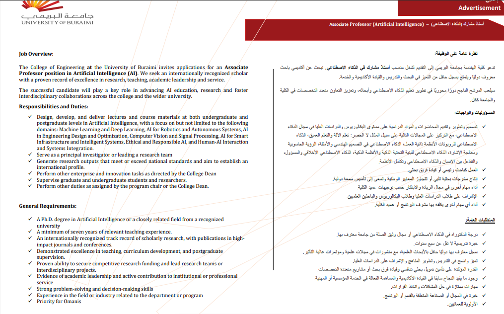 تدعو كلية الهندسة بجامعة البريمي إلى التقديم لشغل منصب أستاذ مشارك في الذكاء الاصطناعي نبحث عن أكاديمي باحث