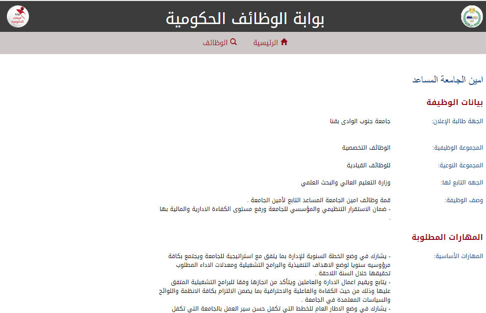 وظيفة جامعة.. أعلنت جامعة جنوب الوادي بقنا، التابعة لوزارة التعليم العالي والبحث العلمي، عن حاجتها لشغل وظيفة أمين الجامعة المساعد، وهي من الوظائف القيادية العليا التي تمثل قمة الجهاز الإداري بالجامعة، حيث يتبع شاغل هذه الوظيفة أمين الجامعة بشكل مباشر.