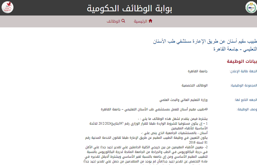 ووفقًا لبيانات الوظيفة، فقد حددت الجامعة عدد 49 وظيفة طبيب مقيم أسنان بنظام الإعارة، وذلك استنادًا إلى القرار الوزاري رقم 397 الصادر بتاريخ 20 فبراير 2024 بشأن اللائحة الأساسية للأطباء المقيمين بالمستشفيات الجامعية، والذي ينص على أن يكون التعيين في وظيفة الطبيب المقيم عن طريق الإعارة طبقًا لقانون الخدمة المدنية رقم 81 لسنة 2016.