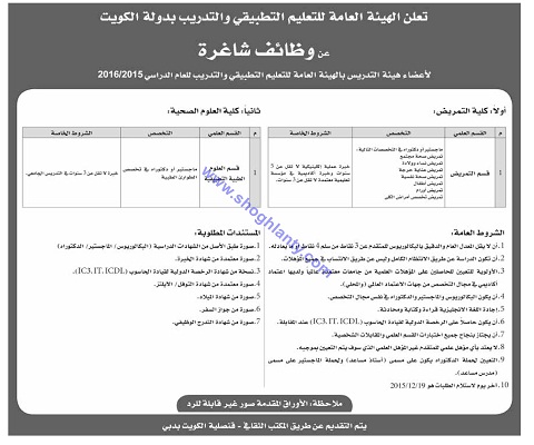 تعلن الهيئة العامة للتعليم التطبيقي والتدريب بدولة الكويت عن حاجتها للتعاقد مع أعضاء هيئة تدريس وذلك في التخصصات التالية: