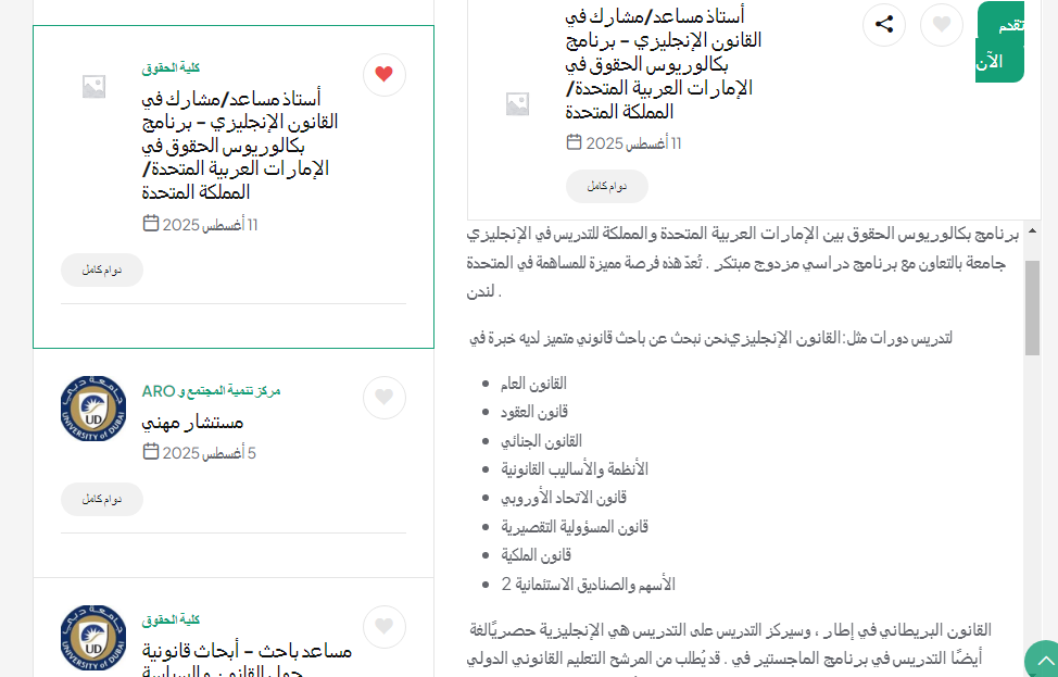 وظيفة جامعة.. أعلنت جامعة دبي عن فتح باب التقديم لشغل وظيفة عضو هيئة تدريس بدوام كامل في القانون الإنجليزي، وذلك للتدريس في برنامج بكالوريوس الحقوق المشترك بين دولة الإمارات العربية المتحدة والمملكة المتحدة.