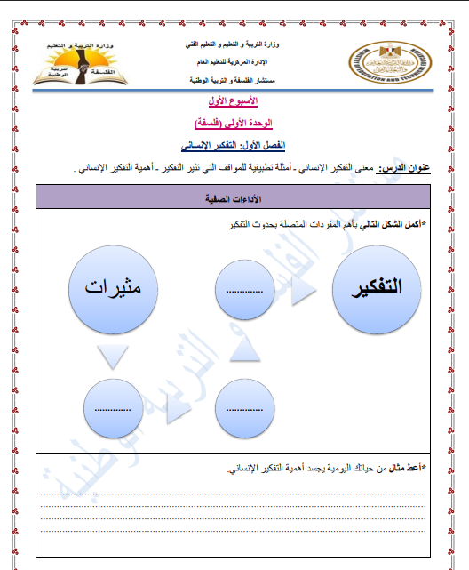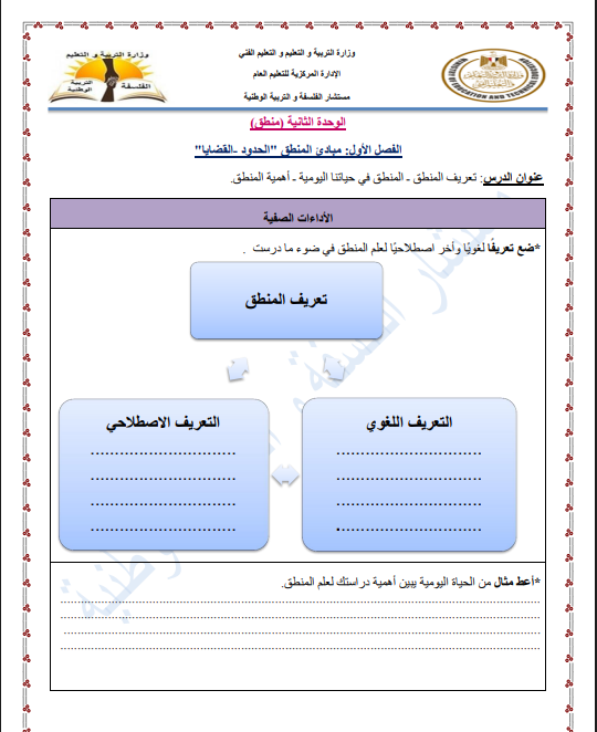 رابط الآداء الصفي الأسبوع الأول الفلسفة والمنطق ترم ثاني الصف الأول الثانوي