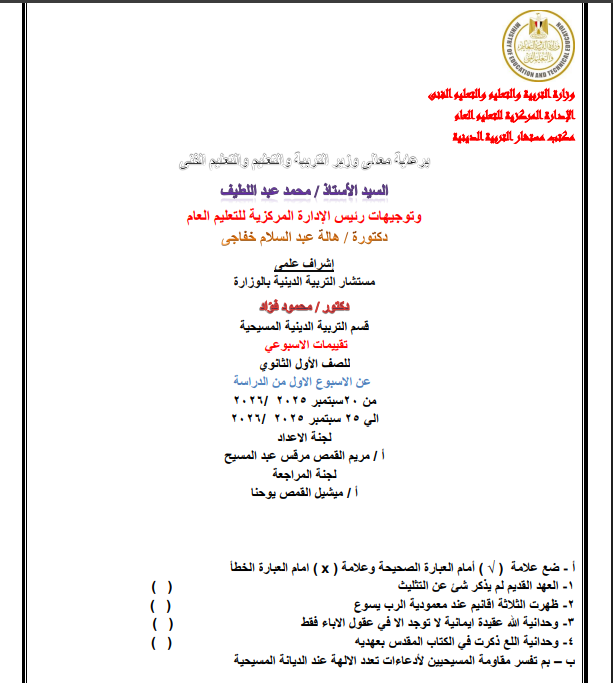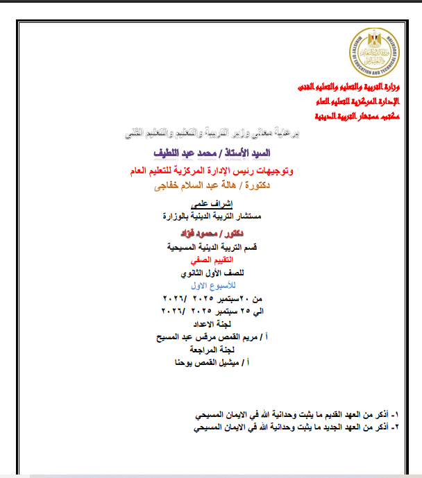 - تقييم الأسبوع الأول التربية المسيحية أولى ثانوي
