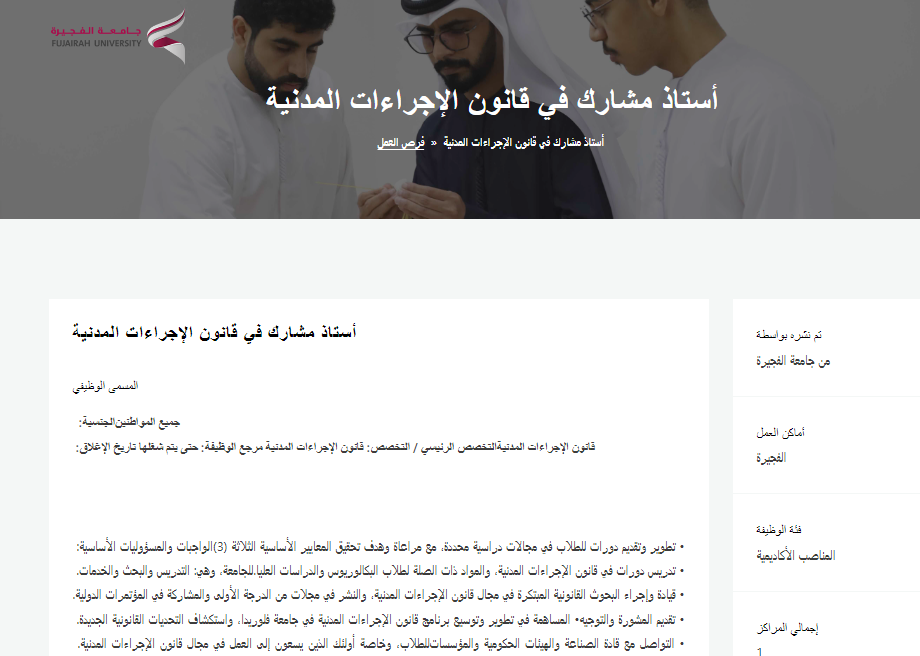 وظيفة جامعة .. تواصل جامعة الفجيرة تعزيز مكانتها الأكاديمية والبحثية من خلال الإعلان عن وظيفة أستاذ مشارك في قانون الإجراءات المدنية، وهي فرصة مميزة للباحثين والأكاديميين المتميزين الراغبين في الانضمام إلى إحدى أبرز الجامعات العالمية. يفتح باب التقديم لجميع الجنسيات، ويظل الإعلان متاحًا حتى يتم اختيار المرشح المناسب لشغل المنصب.