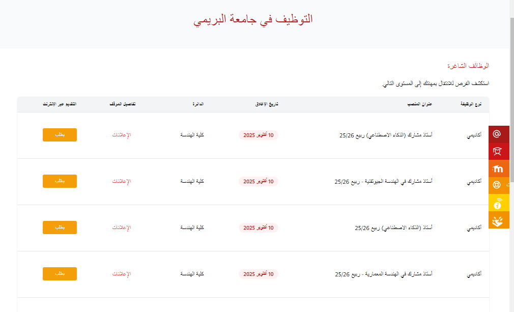 هذه الوظائف تمثل فرصة حقيقية للباحثين والأساتذة الراغبين في الانضمام إلى جامعة تسعى باستمرار إلى الابتكار والتميز ويُمكن للراغبين التقديم عبر المنصة الإلكترونية للجامعة في المواعيد المحددة لكل وظيفة.