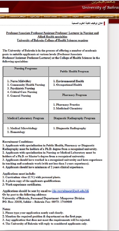 تعلن جامعة البحرين عن توفر وظائف أكاديمية شاغرة (أستاذ مشارك / أستاذ مساعد) للعام الدراسي 2015/2016 وذلك في التخصصات التالية:-