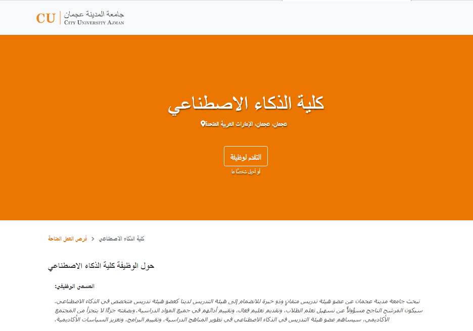 تسعى جامعة مدينة عجمان من خلال هذه الوظيفة إلى استقطاب أكاديمي يتمتع بخبرة واسعة في تدريس مقررات الذكاء الاصطناعي وتطبيقاته، وقادر على تقديم تجربة تعليمية تفاعلية متطورة تُمكّن الطلاب من اكتساب المهارات التي تؤهلهم للمنافسة في أسواق العمل المستقبلية.