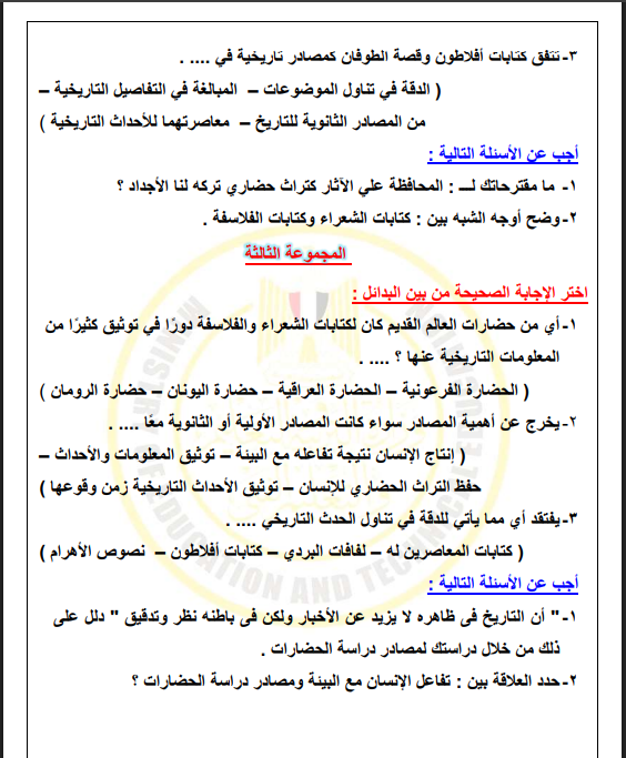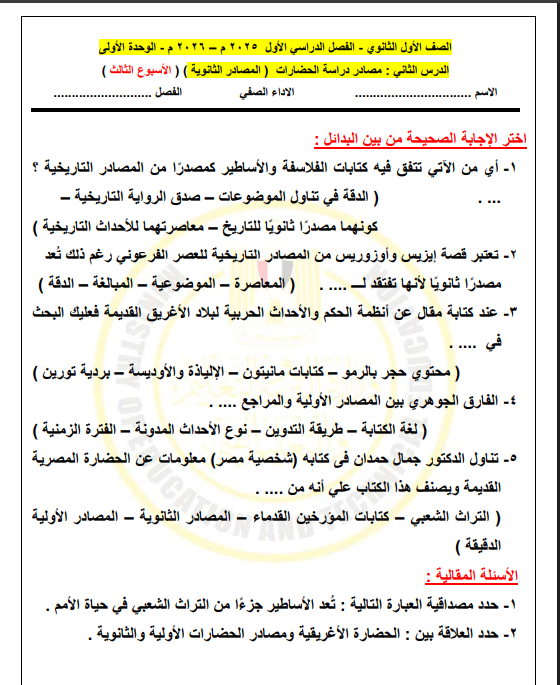 مراجعة نهائية.. أسئلة تقييمات الأسبوع الثالث التاريخ الصف الأول الثانوي