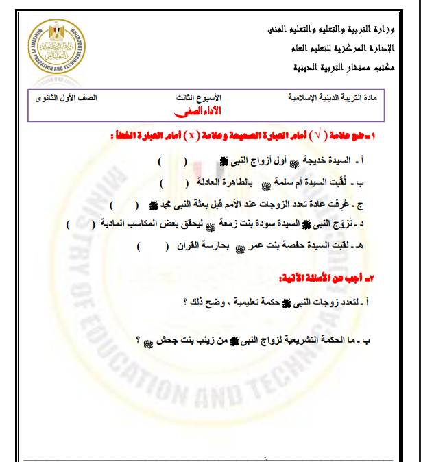 - حل التقييم الاسبوعي للصف الأول الثانوي التربية الاسلامية
